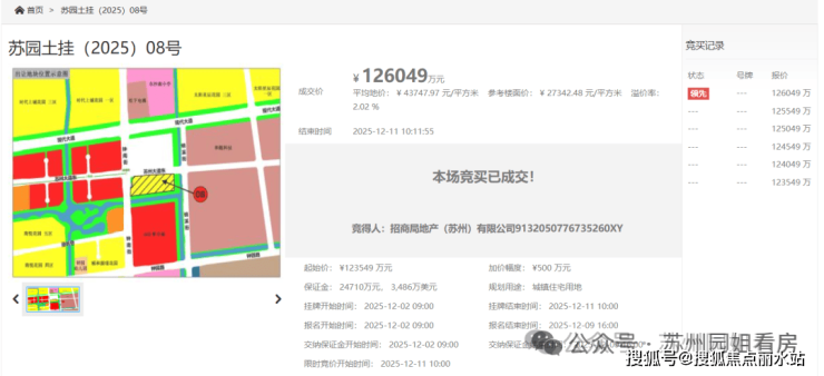 去年12月中旬土拍中,招商以总价约12.6亿竞得,成交楼面价约为27342元/㎡,溢价率2.02%。