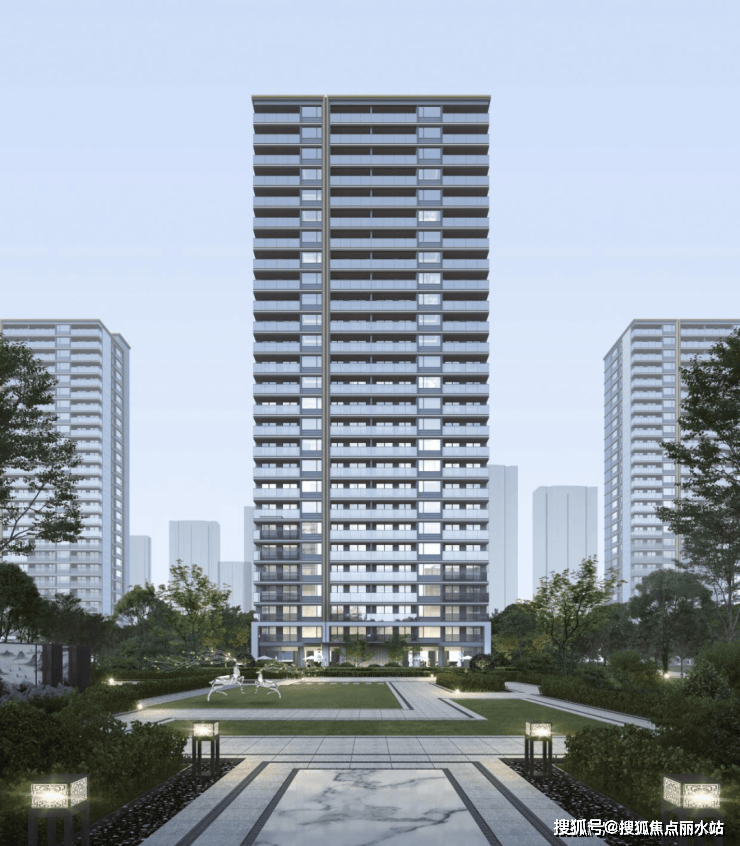 住宅立面:以“超平理念”为灵感,“消隐”的立面,辅以绿城的 ART GRAY 高级灰与平整玻璃设计,呈现通透轻盈,弱化高层的压迫感。 中部比例分割,使立面形体灵动;顶部形成收进,塑就城市桂冠形象。