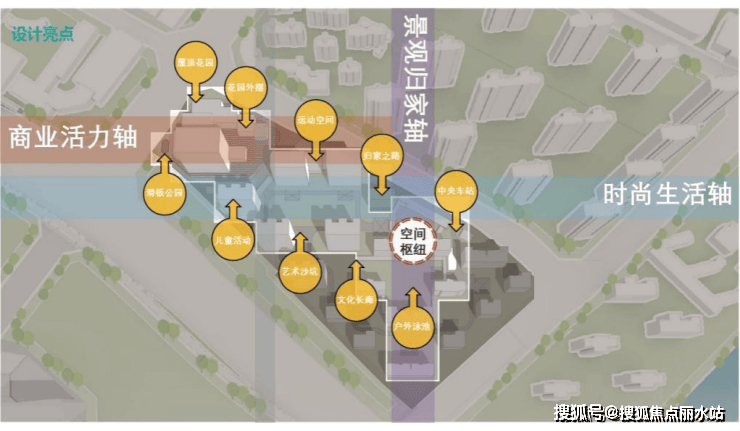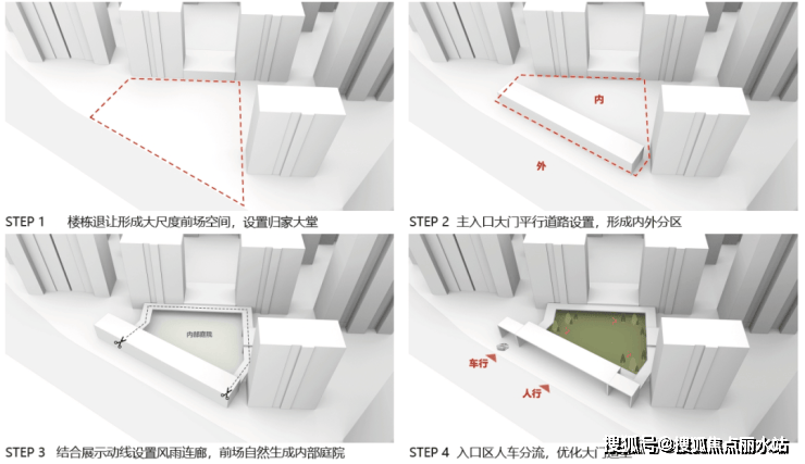 归家小院:利用消 防尽 端道路设置泳池等候休憩花园,满足家长等候的需求,也能为泳池提供后续放置水壶、毛巾等临时 需求的空间。