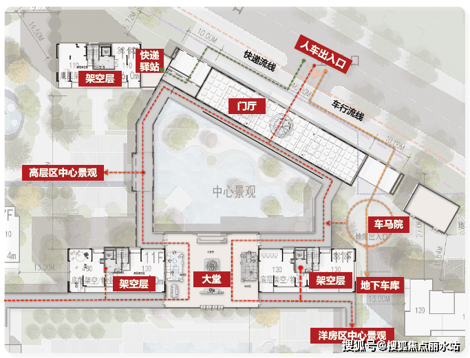 主入 口:结合60米礼仪广场,三进式布局,一进酒店式大堂,摩登典雅;二进迎宾回廊,静水微澜;三进中心 泳池,碧海晴天。层层递进,打造沉浸式归家体验,登高场地联动宅前小径设计,梳理归家动线。地下室一层主车道串联坡道,以环路串联次车道,明晰高效。