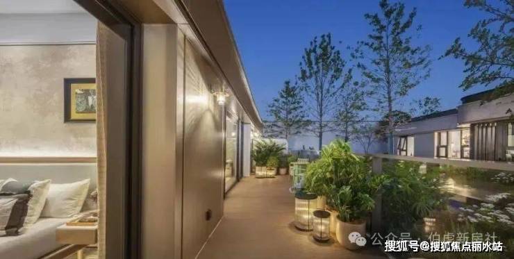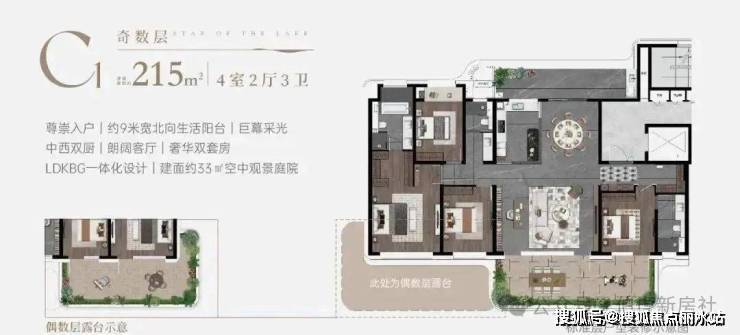 "一方云端庭院,让院落情结与现代技艺完美融合——约15-35㎡太湖空中院落,270°环幕揽湖光,6米挑高引清风,既是瑜伽观星的诗意栖居,亦是烧烤派对的社交主场,重构峯层生活的精神容器。"