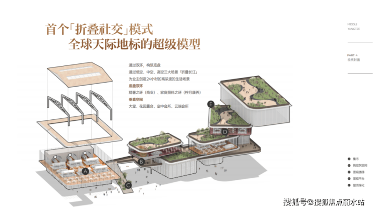 该模式通过「底盘双环」(精密商业环与家庭照料环)与「垂直三境」(低空花园露台、空中会所、云端会所)立体交织,将社交、生活与服务功能精密嵌入建筑的不同标高。
