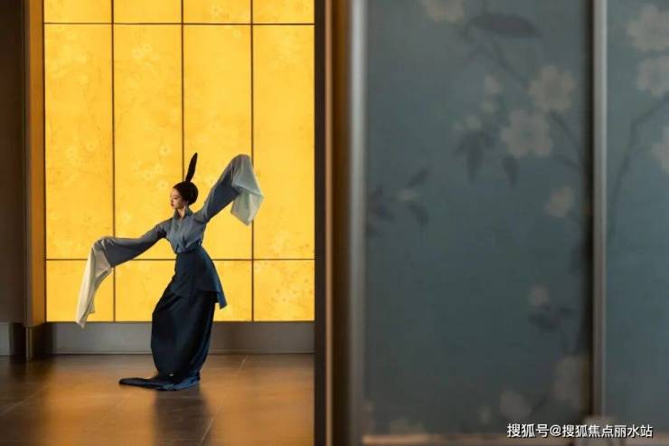 通过刻意抬高的阶梯,正中间千里江山图照壁,和以汉绣编织纹理为灵感、以海棠为元素的格栅和门楼融为一体,最终组成一幅新中式画卷