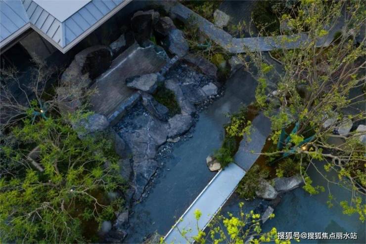 由瀑布、石景、下沉水景打造的立体三维景观,通过会客空间“闻玉亭”尽收眼底