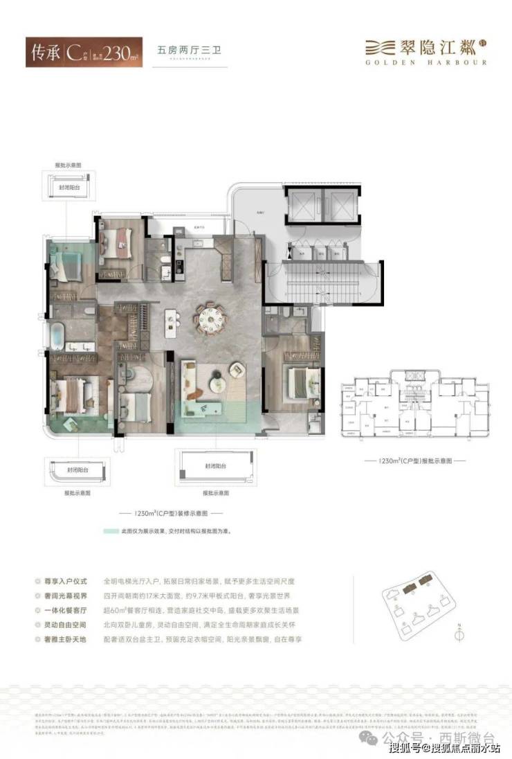 其中,161方共计96套,占比34.5%,做4房3卫户型;185方共计110套,占比39.6%,做4房3卫户型;230方共计72套,占比25.9%,做5房3卫户型。