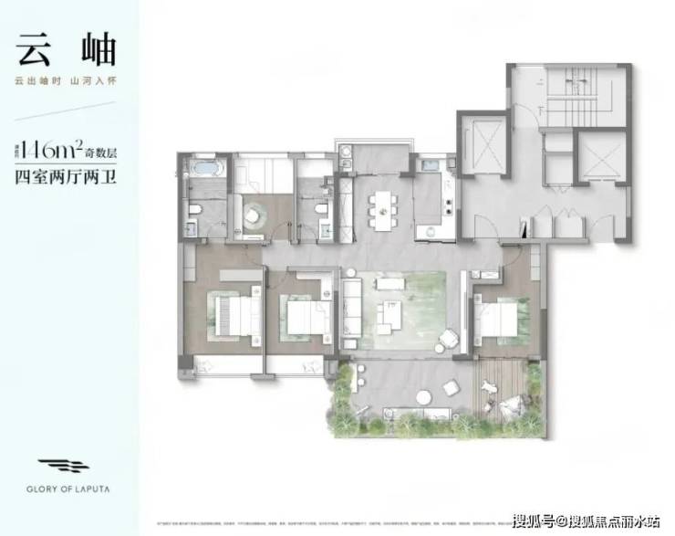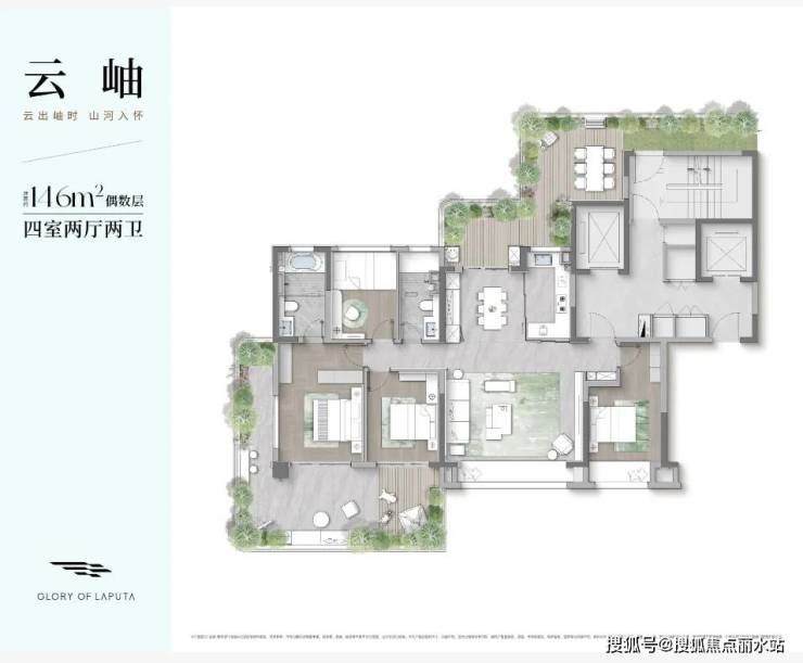 其中,建面约146㎡户型打造为四房两卫,偶数层配备南向L型超大空中庭院,四开间朝南,三卧室南向布局,北侧还规划有庭院空间,通透敞亮。