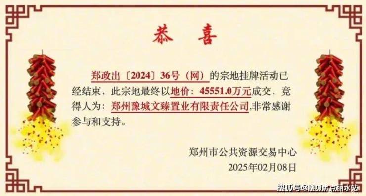 回溯其土地历程:2025年2月8日,郑州豫城文臻置业(中原城投)以起始价4.55亿元摘得该地块,楼面价约5015元/㎡。