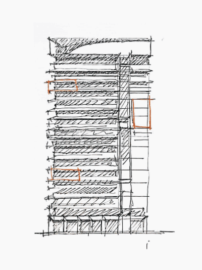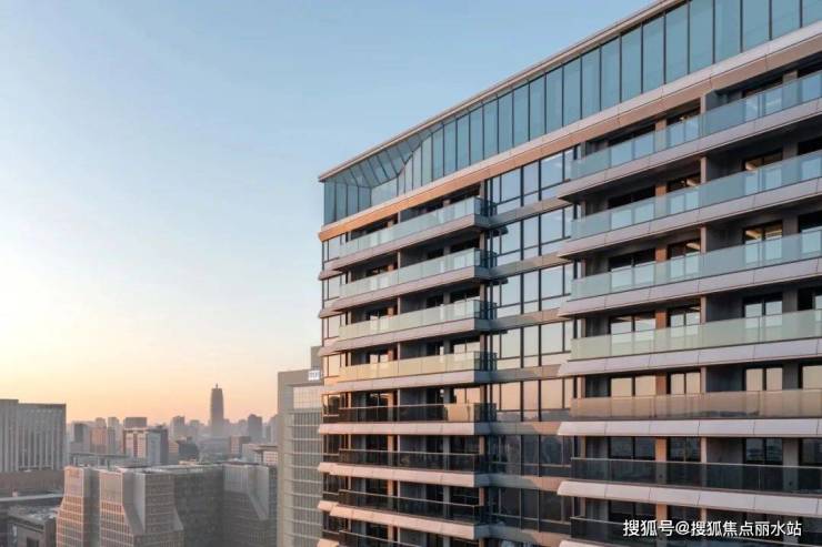 现代主义设计风格只是一种设计语汇,灵活的立面与合理的功能性平面结合是建筑师在设计之初多次尝试和研究的结果。简洁立面表情对城市风貌和居住体验都是一种崭新的尝试,一种现代语言与经典秩序相融合的微创新。我们把铝板线脚采用18°斜切铝板,与玻璃幕墙一体构成现代简洁挺拔的公建化立面,且极具自己的个性却又不十分张扬。在平面设计上,我们把造型诉求考虑进去,南北都尽量拉平,避免较大的凹凸,为公建化立面创造条件。