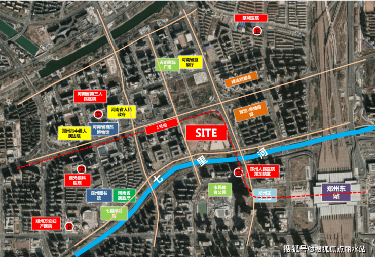 项目位于CBD板块和高铁板块的交汇地带,交通方面,位于郑东新区金水东路与东风南路交汇处(均为城市重要主干道),紧邻地铁1号线东风南路站, 距1号线农业南路站400米,距郑州东站1公里,交通极为便利。南侧紧邻七里河、七里河公园,东区市民体育公园,景观资源丰富。基地分为南北两个地块,容积率高达5.5,总计容面积69.8万平方米,其中幸福里住宅29.3万平方米。