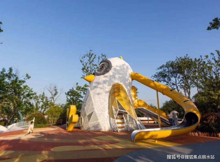 夕阳西下,忙碌了一天的父母带着孩子来到这里。当孩子沉浸在精灵鸟洞洞滑梯的快乐中,可以和爱人牵手坐在长椅,看霞光铺满天际。