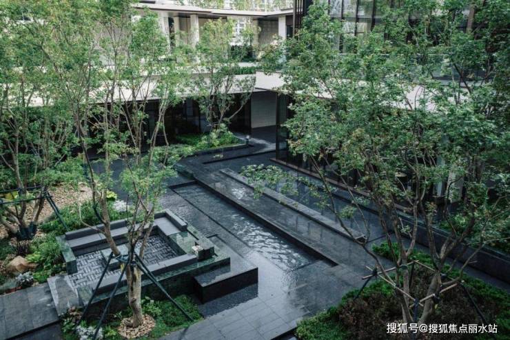浮岛水院内,六棵60年树龄黄蜡扎根镜水之上;两侧叠水向中央汇聚,形成中式意境里的“四水归堂”意境。