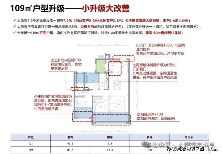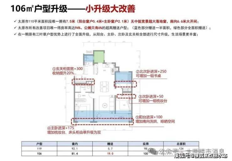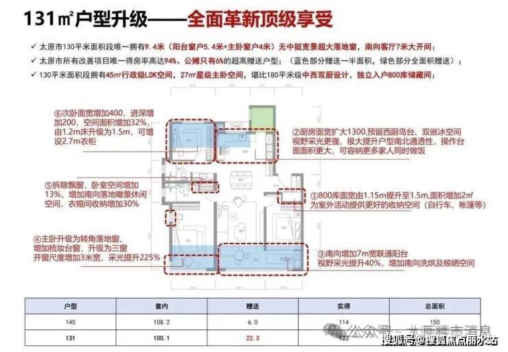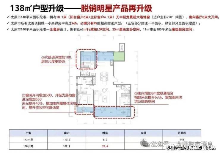 太原市所有改善项目唯一得房率高达94%、公摊只有6%的超高赠送户型;(蓝色部分赠送一半面积,绿色部分全面积赠送);