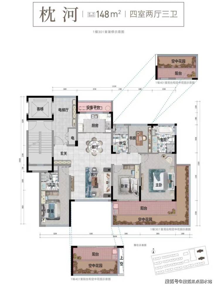建面约148㎡户型,最大可拥有约16米的南向面宽,视野和采光都非常不错。