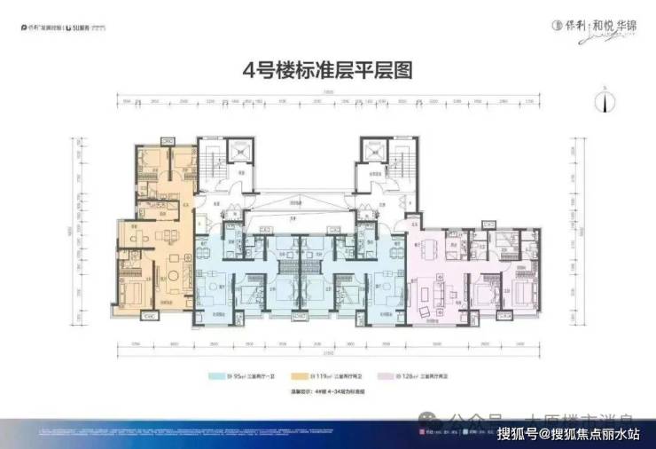保利和悦华锦,四号楼的标准层平层图。西把边户是119平大三居,中间两户是95平小三居,东把边户是128平大三居。两个大三居户型,北侧无连廊影响。95平小三居,户型方正。