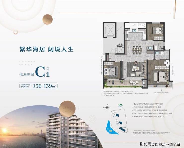 以建面约136—139㎡三室两厅两卫户型为例,独立电梯入户,私密性、功能性和实用性完美的结合,打造尊贵的归家体验。三开间朝南,面宽高达约12.4米,可尽揽清风、阳光入户。约7.8米的南向双开间阳台,极大的延伸了生活空间,提供了IMAX级别的无敌瞰景视野,完美实现室内、室外景观的融合。