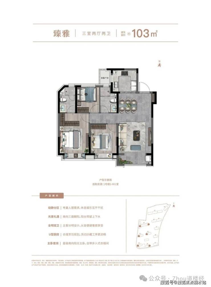 户型特点:类「1T1」电梯配比;南向三面朝阳;阳台预留上下水;全明双卫;U型厨房