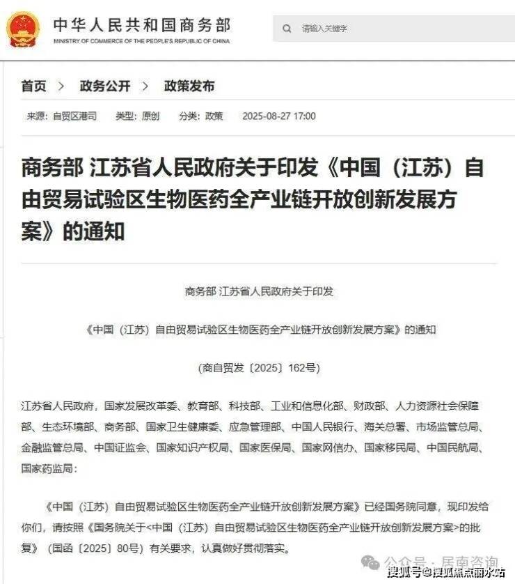 8月28号商务部、江苏省人民政府正式印发了关于《中国(江苏)自由贸易试验区生物医药全产业链开放创新发展方案》
