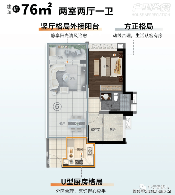 建面76平北向两房一卫,常见竖厅设计,U型厨房,厅出阳台,进屋独立玄关,超长餐边柜,在售南区,总价260-270万左右。
