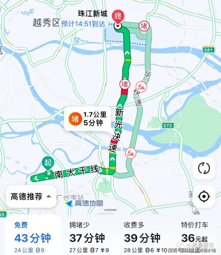 自驾去珠江新城:南大干线接新光快速路,再转猎德大道,全程24公里到珠城,耗时43分钟。