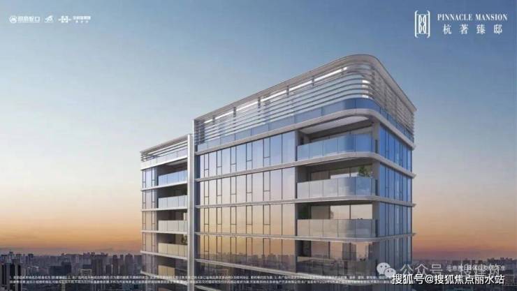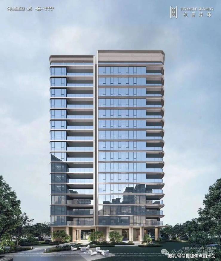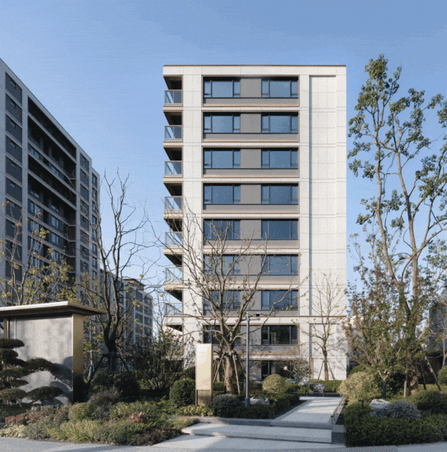 杭州招商·杭著臻邸住宅顶部采用构架升上去一层,屋顶飘檐采用金属框架和横向细致的格栅作为装饰,高低对比,简洁大气,让头部显得轻盈,同时具备很强的识别性和现代感的特点。