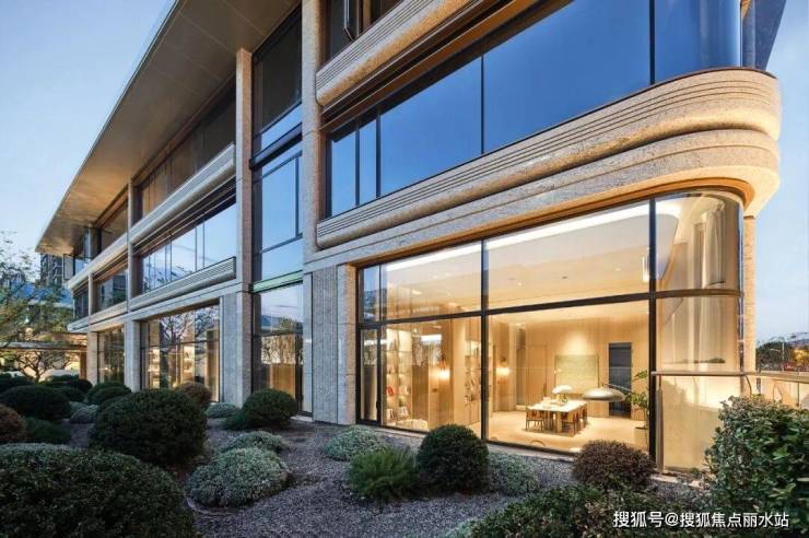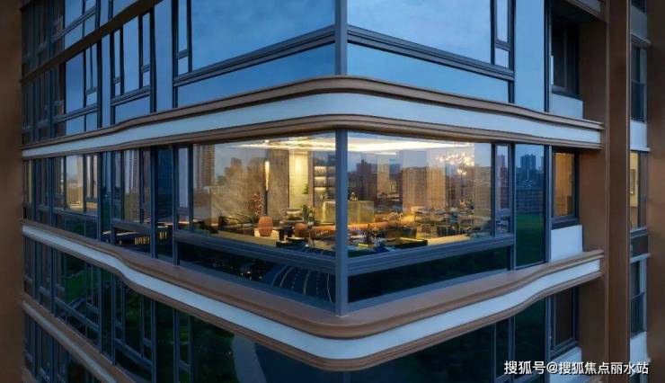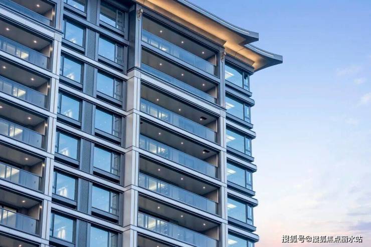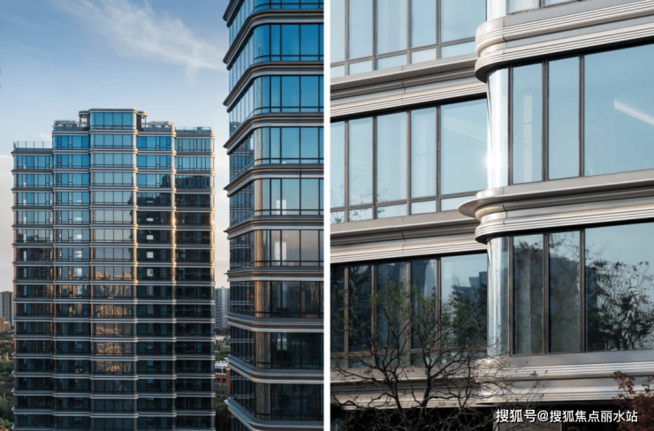 比如,杭州招商·杭著臻邸住宅中部标准段竖向采用金属划分身段的比例,横向采用浅色色横向腰线作为层划分,大面积玻璃幕,两种颜色形成对比,不失单调简约大气,建筑的南北两面,均有多处270°弧线元素,线条流畅高级,将观景视野进一步拉宽,还形成双面采光的转角厅。