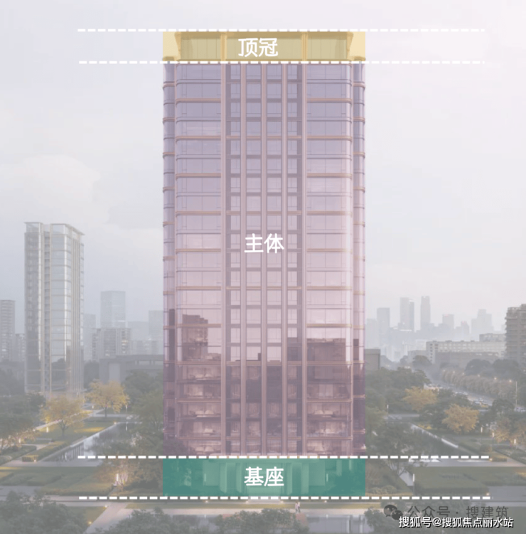 1、基座(Base):高度约占建筑总高的1/8~1/6(通常为2-3层),以材质(石材/仿石铝板等),增强稳重感。