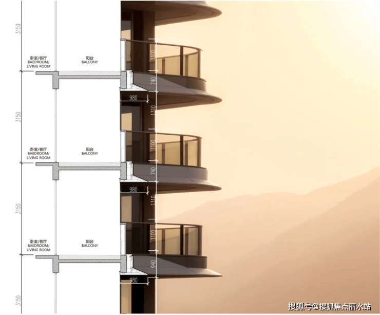 立面采用的大块超白玻璃,曲线形状的大阳台如层层海沫一般轻盈地漂浮在立面上错层的阳台设计让立面也更加的灵动。
