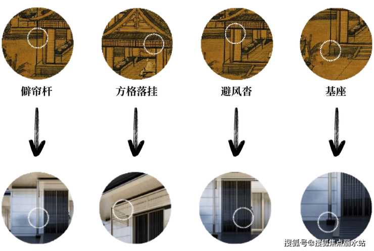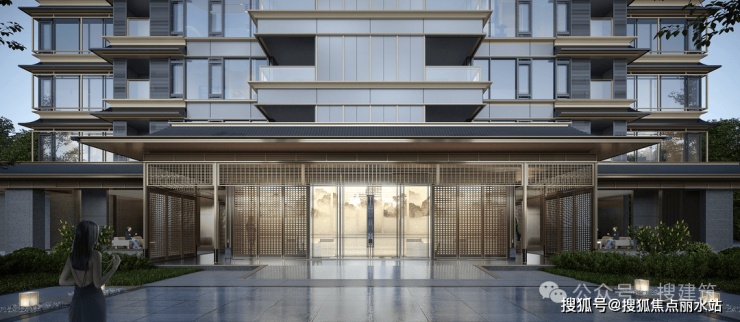 入户大堂首层无住宅落地,留出空间与外部环境对望,沟通,互动,精巧而庄重的设计让踏足至此的宾客感受宋代特有的仪式感。基座保留“擗帘杆”独特的美学特点,用运用简洁的线条来表现其纤细精巧,更具流线型的美感。“挂落”垂于“重檐”之下,让立面层次更加丰富,彰显淡雅精致的宋式建筑韵味;格栅与立面的简洁线条结合,为建筑增添独特视觉效果。