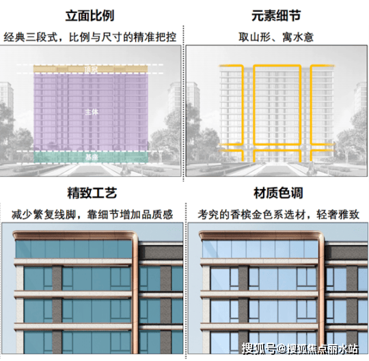 2、主体(Body):占比约60%-70%,注重竖向或横向线条韵律(如窗墙系统、装饰线条)
