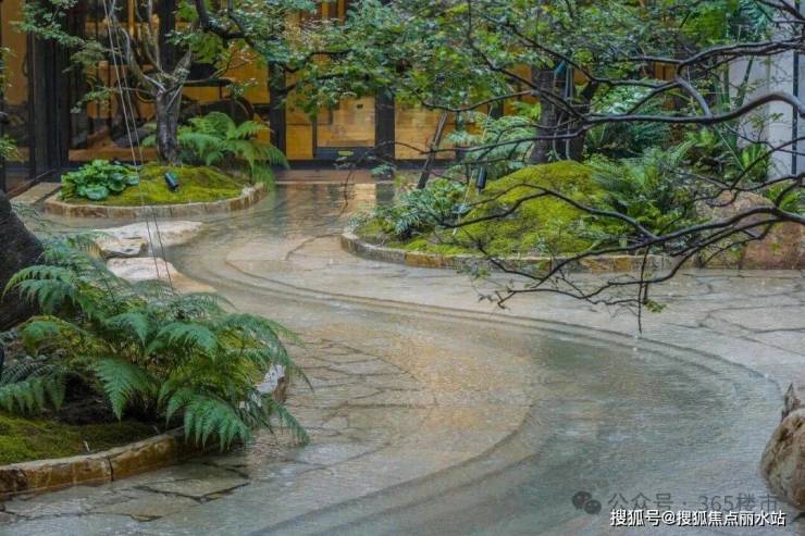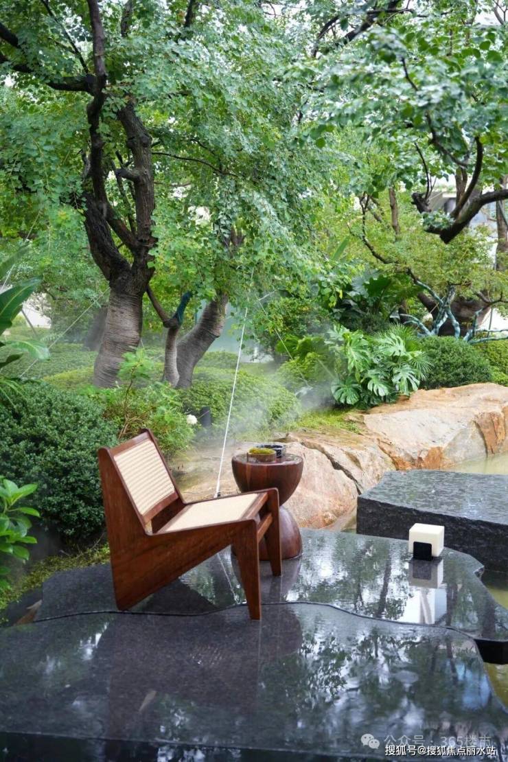 雨点坠入下沉式庭院内,漫过婉约曲折的水道,石景在雨雾中若隐若现。