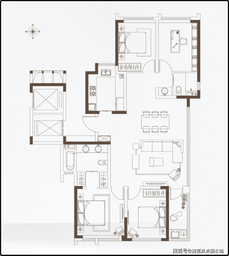 该户型四室两厅两卫,户型设计方正,带来全明大横厅;四房设计+主卧套间设计,充分满足改善客群复杂的功能需求。