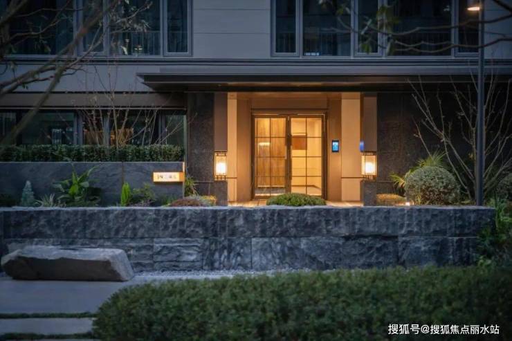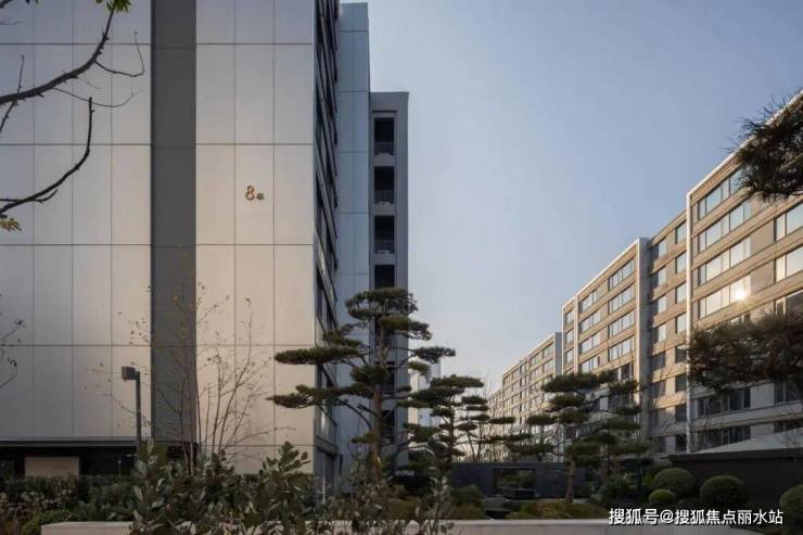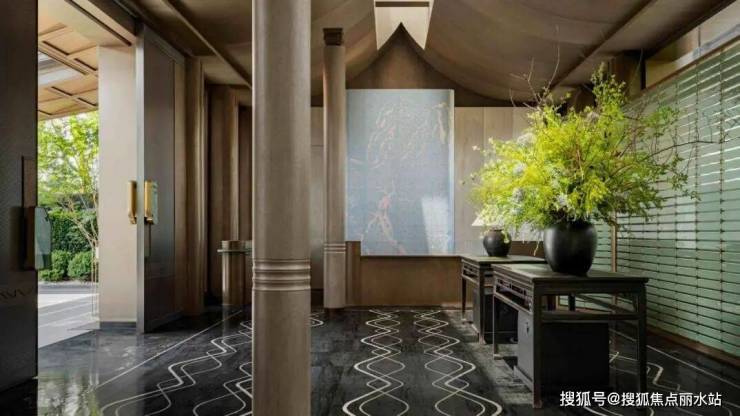 安璞轩地上归家动线以雅奢酒店为蓝本,北门气派恢弘,门后七棵姿态盎然的油松,是万科在绍兴首度采用松树造景,奠定归家第一重礼序。