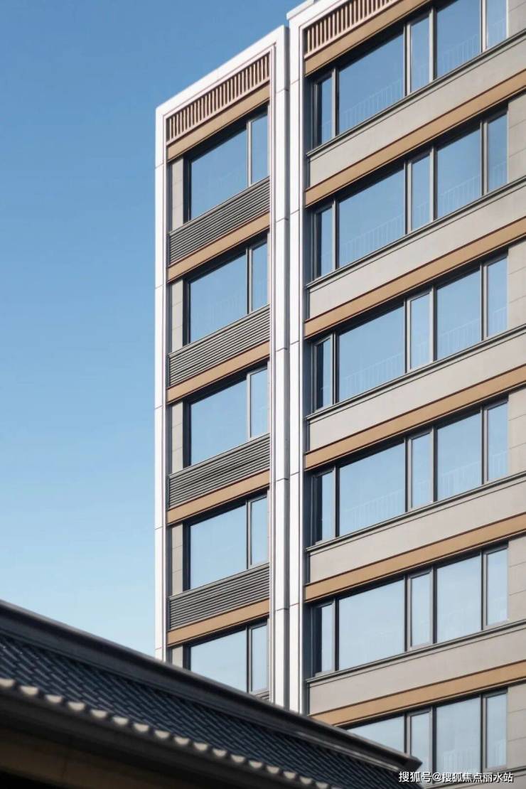 绍兴市面上少有的7-9层洋房,建筑立面线条挺拔利落,体块错落有致,搭配“安系”标志性的挑檐,安曼金铝板与银灰铝板、深灰色石材及金属格栅相映衬,构筑出雅致而富有质感的立面形象。