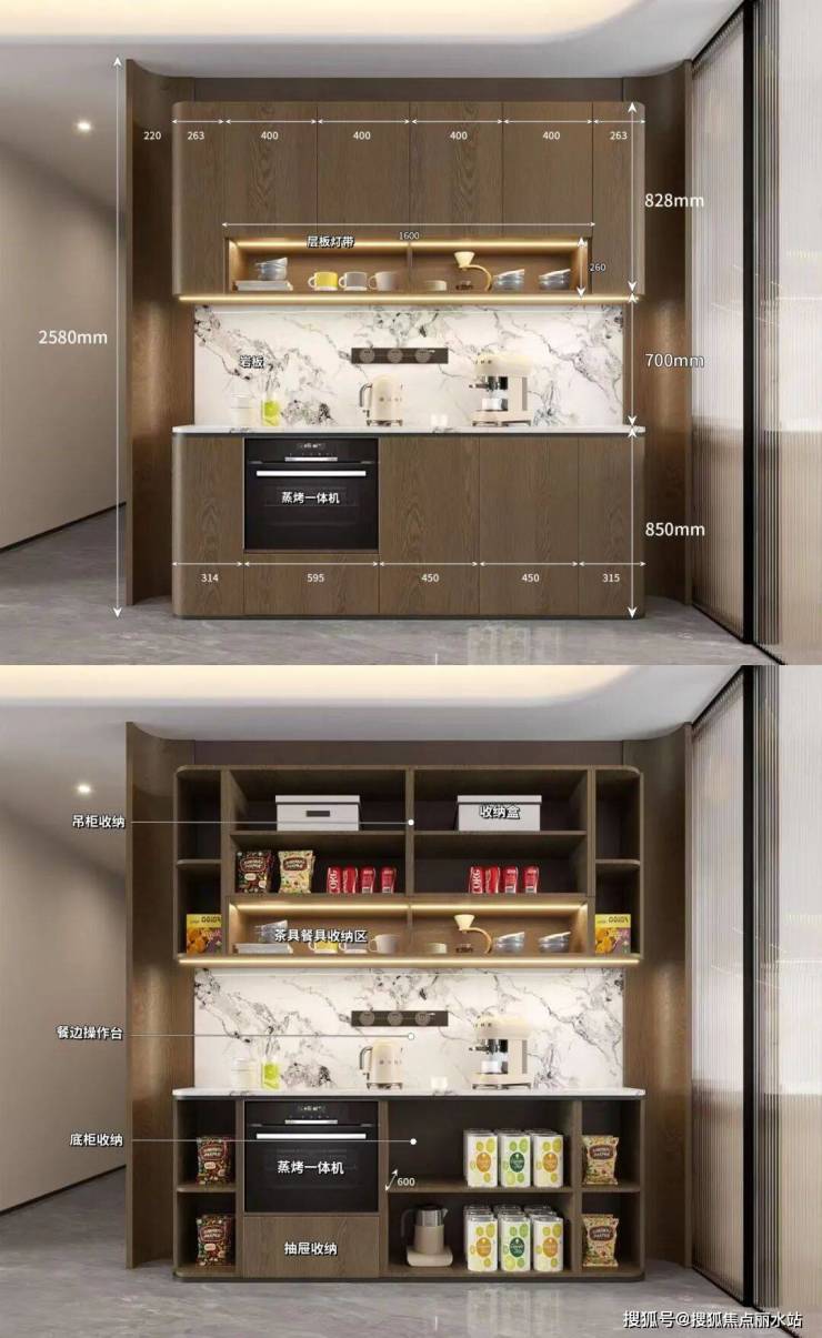 柜体内部功能分区细致实用,木质抽屉搭配顺滑轨道,专为茶咖用品及就餐工具而设;封闭储柜则轻松收纳米面粮油及日常杂物,嵌入式蒸烤一体机,进一步提升功能复合度。从弧线造型到每一处收纳规划,都让餐边空间成为实用、整洁且充满温度的一角。