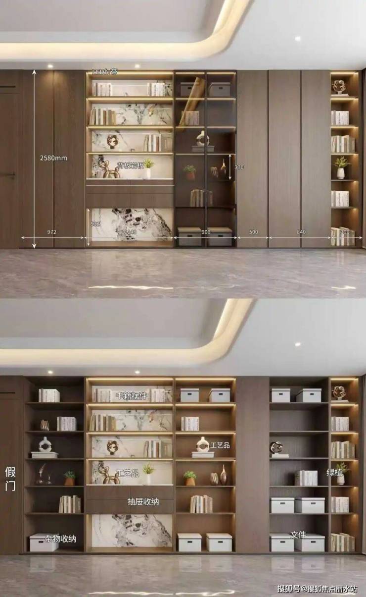 开放格背板选用与交标同色系的石材延伸上墙,质感统一而高级,玻璃柜门内置柔和灯带,让陈列的书籍、艺术品宛如展馆藏品般精致,封闭柜则藏纳日常杂物,保证客厅整洁大气。