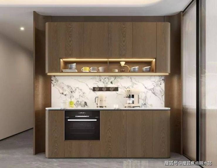 整体采用吊柜+地柜的组合形式,封闭与开放交替呈现。上方吊柜虚实结合,开放格内嵌柔和灯带,可陈列常用杯具或装饰品;下方操作台延伸石纹岩板至墙面,并集成可移动轨道插座,方便咖啡机、榨汁机等小电器灵活使用,俨然一个简约温馨的家庭水吧。
