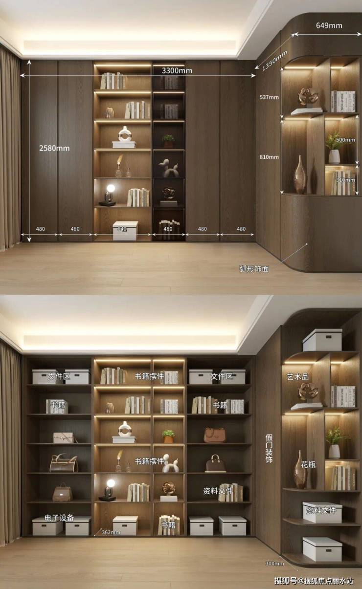 书柜以L型布局巧妙环绕墙垛,将空间结构转化为收纳优势。转角处采用流畅的圆弧造型,既缓解了进门拥堵感,也让视觉过渡更柔和通透。融合封闭式与开放式设计,兼顾收纳与展示功能。
