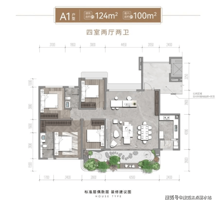 雅颂各户型均为光厅入户+主卧套房设计,且配备可变空间,可以根据家庭需要随意切换。以建面124㎡的A1户型为例,约15㎡的独立全明光厅入户,可打造小型入户花园、外置玄关、落客休息区等功能空间。室内约33㎡的餐客厅空间加上约24㎡的挑高庭院,整体近57㎡的家庭核心社交空间,可扩展出娱乐区、阅读区、影音区、游乐区等多样化功能场景。约20㎡的主卧套房设计,同时每个次卧空间阔绰、采光通风俱佳。该户型在四房格局下,仍能在餐客厅区域设置一个可开可合的书房空间,灵活切换,满足全家庭生命周期的空间需求。