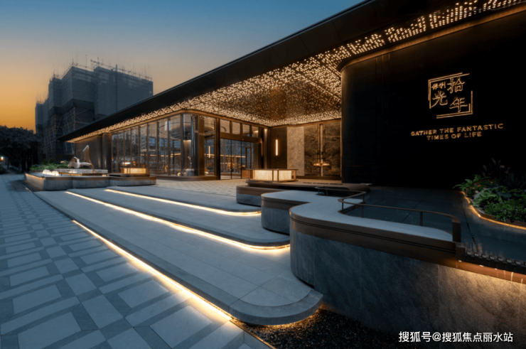 而门庭雕像“玉带环腰” 取材于悦来江岸意象,整体长度超52米,配套约6米高的仪式墙,采用奢石打造,尽显宏伟大气。归家轴线上,艺术连廊连接大门与会客厅,以香槟金与新西兰灰进行冷暖色调搭配,延续主入口的典雅基调;同时,下沉式庭院水景、围炉雅亭、风华岛、童趣区等景观节点由连廊串联,移步异景。而楼栋入口高度约4.2米,两侧墙面均采用大理石铺装,顶部铝板采用酒店式的星空顶设计。从气势恢宏的主入口到社区景观、再到楼栋入口,让归家路径在感受江湾魅力的同时,仿佛置身于星级酒店享受度假的休闲时光。