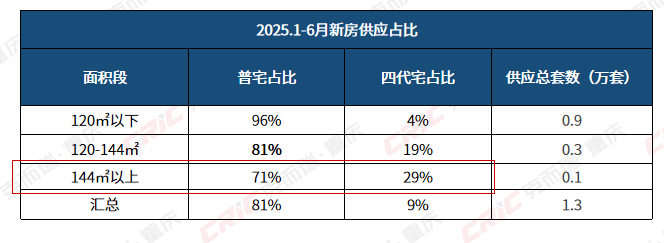 2025上半年重庆中心城区新房供应数据显示,在建面120-144㎡面积段的产品中,四代住宅供应占比达19% 左右。而建面144㎡以上的产品中,近3成为四代宅。