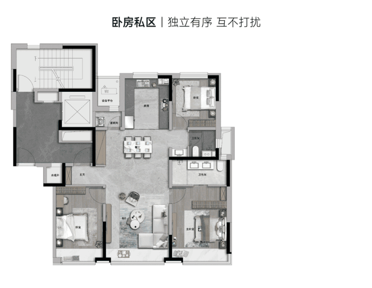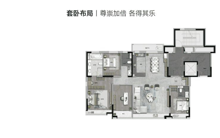 经典三叶草布局,三个卧室以起居空间为中心,各自独立,互不打扰,同时又能保持很好的统一。主卧约22㎡套房设计,270°转角落地窗+双台盆卫浴空间+衣帽间的高规格配置,更健康私密独立,集收纳、观景、休憩等功能于一体,营造更奢适朗阔的居住环境。次卧紧挨客卫,形成准套房设计,就近满足洗漱需求,提升居住便利性,让每处空间尽展舒适。