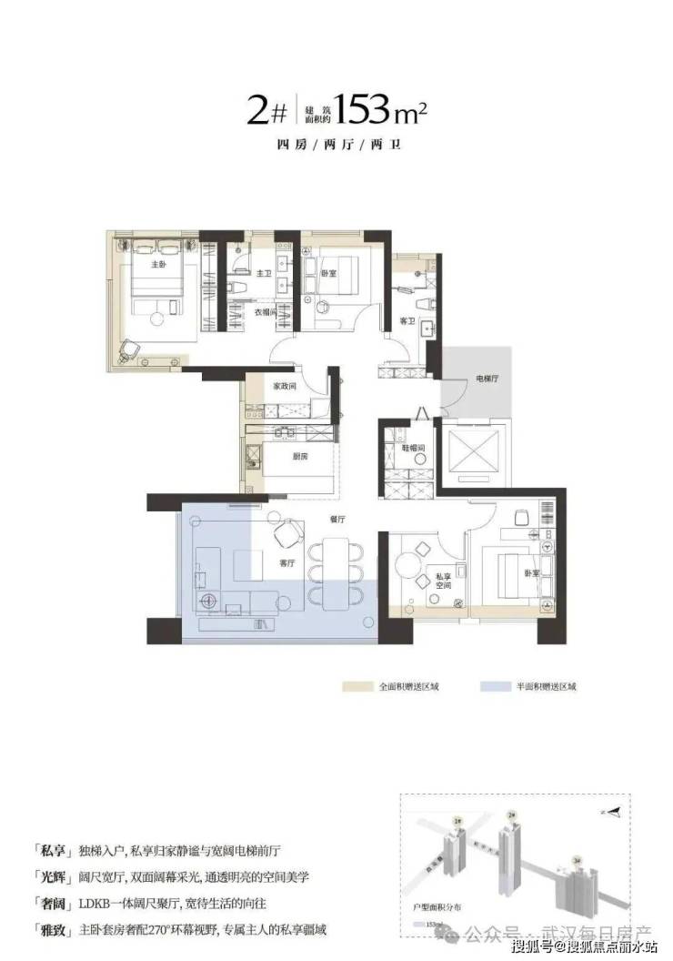 户型设计:主力户型为146-188㎡三至四房,两梯两户纯板式结构,得房率约95-96%