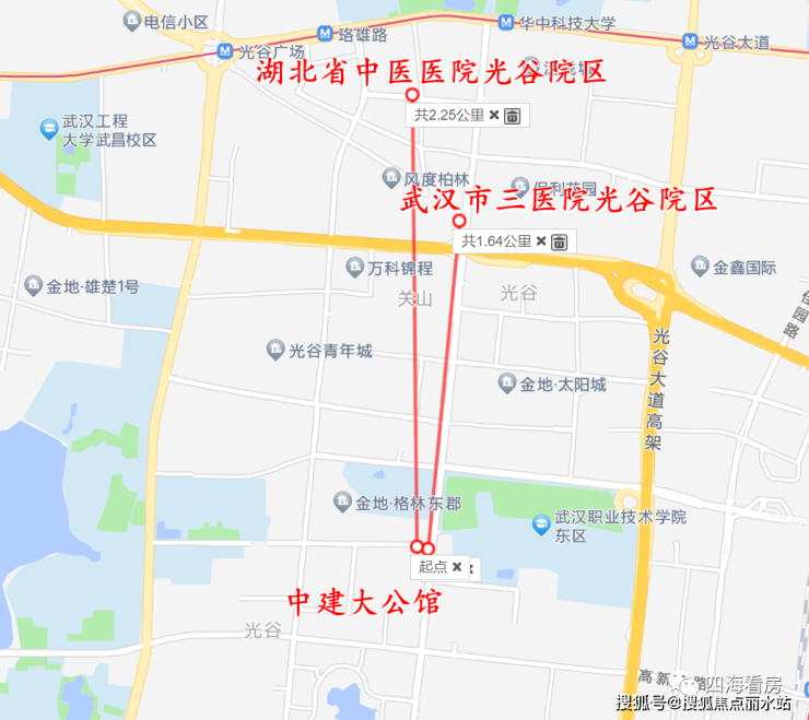 自驾:项目沿关山大道向北可直达华科、光谷广场,街道口等商圈,沿南湖大道上光谷大道高架,有匝道口可以走雄楚大道高架和三环线,快速到光谷中心城。走雄楚大道向西可直达二环线。
