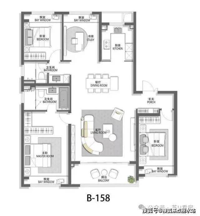 同样是5开间朝南,南向面宽拉升至约21m!甚至阔气到将两个次卫都放在了南面,3卫全明!