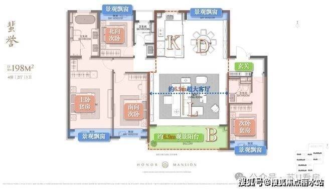 餐客厅阳台组成LDKB超大社交方厅,近80㎡的奢阔,约6.9m的客厅加上三个卧室,近乎是5开间朝南。