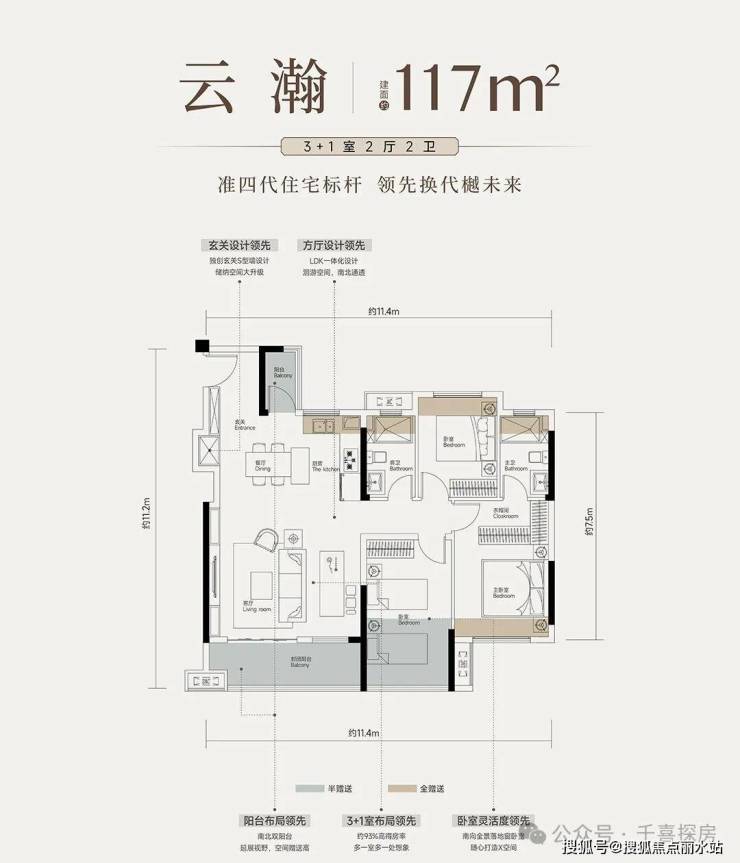 4号楼总高34层,一个单元,2梯4户,包含建面约103-129平房源