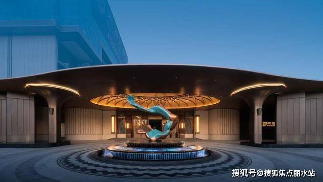 项目入口界面宽约43米,以阵列式的三维铝板柱帽构建秩序感。顶部设计为暗金珠光曲线的穹顶,下方点缀有玻利维亚蓝奢石,墙面选用宝格丽酒店同款的维纳多哑光石材,与金属材质形成对比。入口处设置水袖雕塑,以现代艺术语言塑造动态美感。售楼处电话400-8787-098接通后输入5678【营销中心】