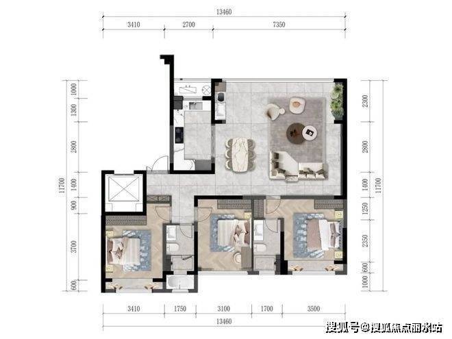 北面空中花园、客餐厅融为一体,形成近48平大横厅。同时,南面面宽约13.46米,规划三个卧室绰绰有余,最小的卧室面宽都有约3.1米的舒适尺度,主、次卧面宽则达到约3.4、3.5米。