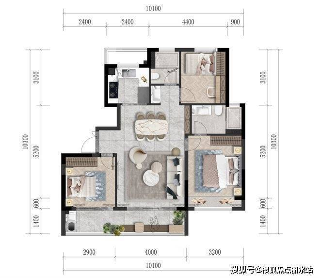 类四叶草户型,客厅在中间,过道融入功能空间,几乎无浪费。客厅面宽约4米,对比市场上105-110平左右户型,客厅面宽在3.7米左右。售楼处电话400-8787-098接通后输入5678【营销中心】