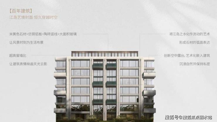 立面设计也是一样的思路,石材+铝板+陶砖竖线点缀,搭配高窗墙比的玻璃,户户带露台,谁看了不说一声江岛明信片的质感啊!